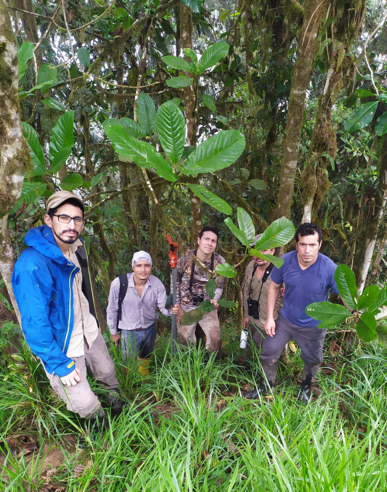 Foto 2: Equipo Jotococo, a lado de la nueva especie de magnolia. De izquierda a derecha: Patricio Mena, Diego Cabrera, Álvaro Pérez, Amado Chávez De La Cruz, Jorge Zambrano